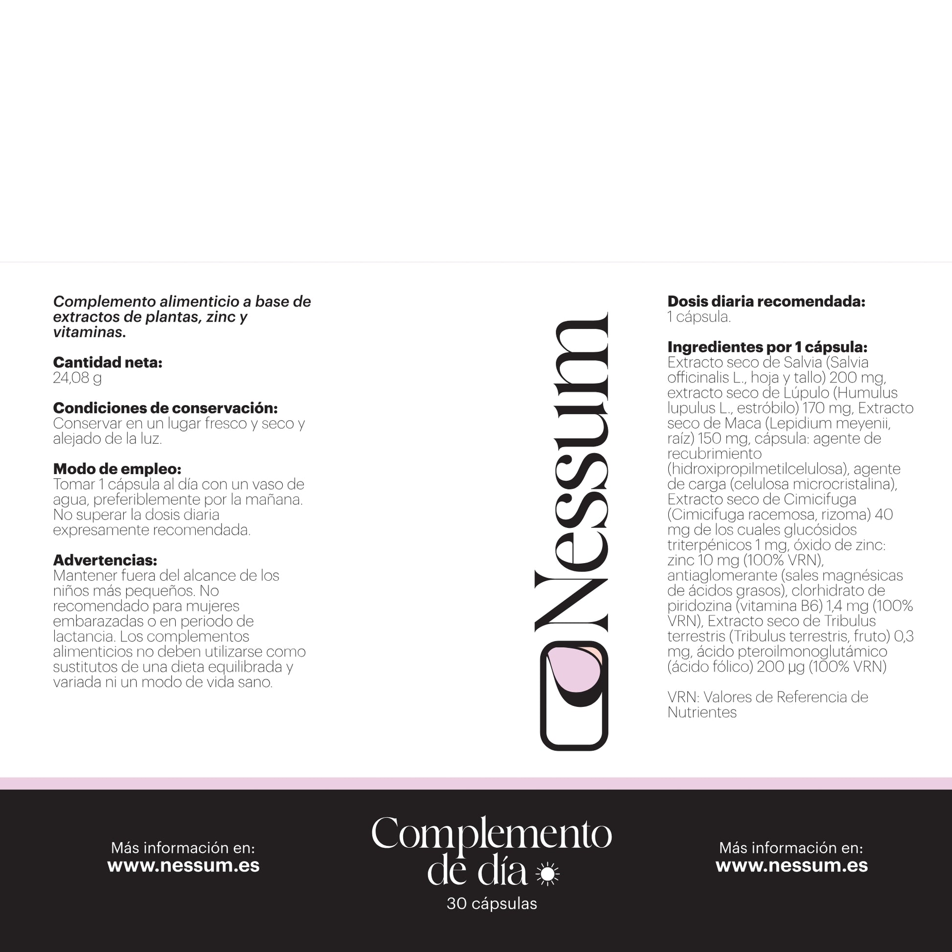 Fórmula natural diseñada para aliviar los síntomas de la menopausia, con Cimicifuga racemosa para reducir sofocos y sudores nocturnos, junto con Lúpulo y Salvia que favorecen el equilibrio hormonal. La Maca Andina y el Tribulus terrestris mejoran la energía, la vitalidad y la libido, mientras que el Zinc fortalece los huesos, piel y cabello, apoyando además el sistema inmunitario. Incluye Vitaminas B6 y B9 para estabilizar el estado de ánimo y contribuir a la salud cardiovascular. Cápsulas veganas, libres de aditivos y de alta calidad, diseñadas para facilitar su uso con una toma diaria.